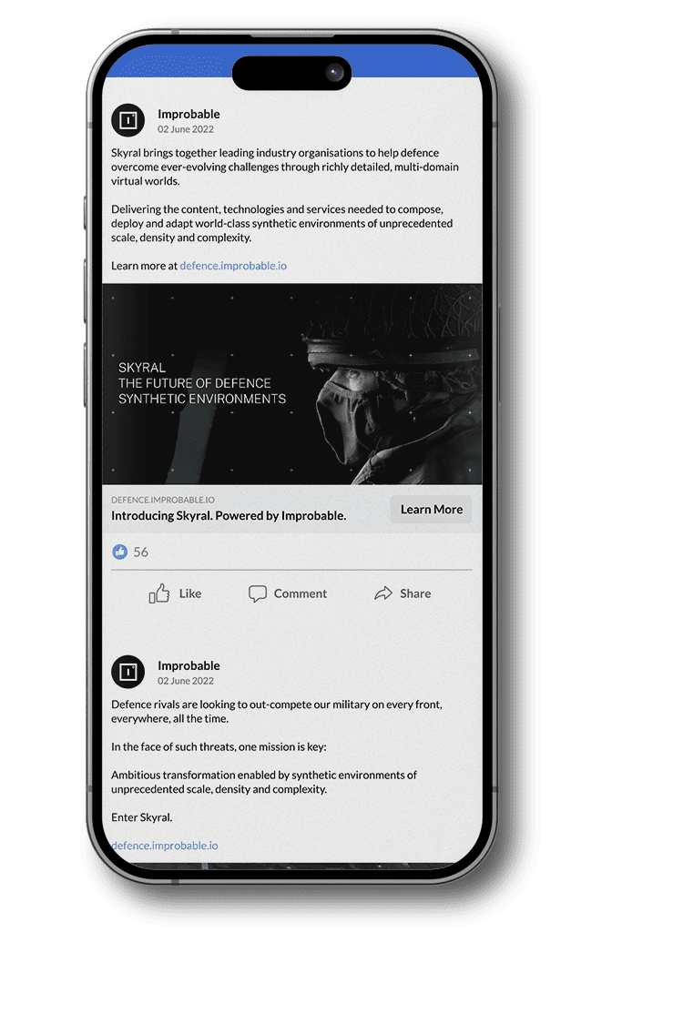 Through our comprehensive support and creative expertise, we helped position Improbable Defence as a leader in the synthetic environment space, setting a strong foundation for their continued growth and success.